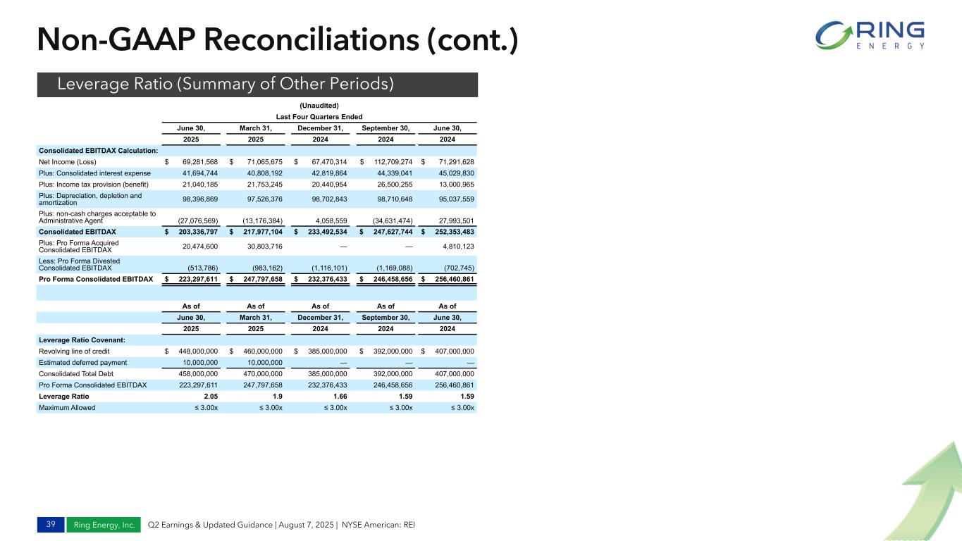 Ring Energy, Inc. Q2 Earnings & Updated Guidance | August 7, 2025 | NYSE American: REI Non-GAAP Reconciliations (cont.) 38 Leverage Ratio (Comparative Period End)Leverage Ratio (Current Period End) (Unaudited) Three Months Ended Last Four QuartersSeptember 30, December 31, March 31, June 30, 2024 2024 2025 2025 Consolidated EBITDAX Calculation: Net Income (Loss) $ 33,878,424 $ 5,657,519 $ 9,110,738 $ 20,634,887 $ 69,281,568 Plus: Consolidated interest expense 10,610,539 9,987,731 9,408,728 11,687,746 41,694,744 Plus: Income tax provision (benefit) 10,087,954 1,803,629 3,041,177 6,107,425 21,040,185 Plus: Depreciation, depletion and amortization 25,662,123 24,548,849 22,615,983 25,569,914 98,396,869 Plus: non-cash charges reasonably acceptable to Administrative Agent (26,228,108) 8,994,957 2,392,703 (12,236,121) (27,076,569) Consolidated EBITDAX $ 54,010,932 $ 50,992,685 $ 46,569,329 $ 51,763,851 $ 203,336,797 Plus: Pro Forma Acquired Consolidated EBITDAX 7,838,163 5,244,078 7,392,359 — 20,474,600 Less: Pro Forma Divested Consolidated EBITDAX (600,460) 77,819 8,855 — (513,786) Pro Forma Consolidated EBITDAX $ 61,248,635 $ 56,314,582 $ 53,970,543 $ 51,763,851 $ 223,297,611 Non-cash charges reasonably acceptable to Administrative Agent: Asset retirement obligation accretion $ 354,195 $ 323,085 $ 326,549 $ 382,251 Unrealized loss (gain) on derivative assets (26,614,390) 6,999,552 375,196 (13,970,211) Share-based compensation 32,087 1,672,320 1,690,958 1,351,839 Total non-cash charges reasonably acceptable to Administrative Agent $ (26,228,108) $ 8,994,957 $ 2,392,703 $ (12,236,121) As of June 30, Corresponding 2025 Leverage Ratio Leverage Ratio Covenant: Revolving line of credit $ 448,000,000 2.01 Lime Rock deferred payment 10,000,000 0.04 Consolidated Total Debt 458,000,000 2.05 Pro Forma Consolidated EBITDAX 223,297,611 Leverage Ratio 2.05 Maximum Allowed ≤ 3.00x (Unaudited) Three Months Ended Last Four QuartersSeptember 30, December 31, March 31, June 30, 2023 2023 2024 2024 Consolidated EBITDAX Calculation: Net Income (Loss) $ (7,539,222) $ 50,896,479 $ 5,515,377 $ 22,418,994 $ 71,291,628 Plus: Consolidated interest expense 11,301,328 11,506,908 11,420,400 10,801,194 45,029,830 Plus: Income tax provision (benefit) (3,411,336) 7,862,930 1,728,886 6,820,485 13,000,965 Plus: Depreciation, depletion and amortization 21,989,034 24,556,654 23,792,450 24,699,421 95,037,559 Plus: non-cash charges acceptable to Administrative Agent 36,396,867 (29,695,076) 19,627,646 1,664,064 27,993,501 Consolidated EBITDAX $ 58,736,671 $ 65,127,895 $ 62,084,759 $ 66,404,158 $ 252,353,483 Plus: Pro Forma Acquired Consolidated EBITDAX 4,810,123 — — — 4,810,123 Less: Pro Forma Divested Consolidated EBITDAX (672,113) (66,463) 40,474 (4,643) (702,745) Pro Forma Consolidated EBITDAX $ 62,874,681 $ 65,061,432 $ 62,125,233 $ 66,399,515 $ 256,460,861 Non-cash charges acceptable to Administrative Agent: Asset retirement obligation accretion $ 354,175 $ 351,786 $ 350,834 $ 352,184 Unrealized loss (gain) on derivative assets 33,871,957 (32,505,544) 17,552,980 (765,898) Share-based compensation 2,170,735 2,458,682 1,723,832 2,077,778 Total non-cash charges acceptable to Administrative Agent $ 36,396,867 $ (29,695,076) $ 19,627,646 $ 1,664,064 As of June 30, 2024 Leverage Ratio Covenant: Revolving line of credit $ 407,000,000 Pro Forma Consolidated EBITDAX 256,460,861 Leverage Ratio 1.59 Maximum Allowed ≤ 3.00x